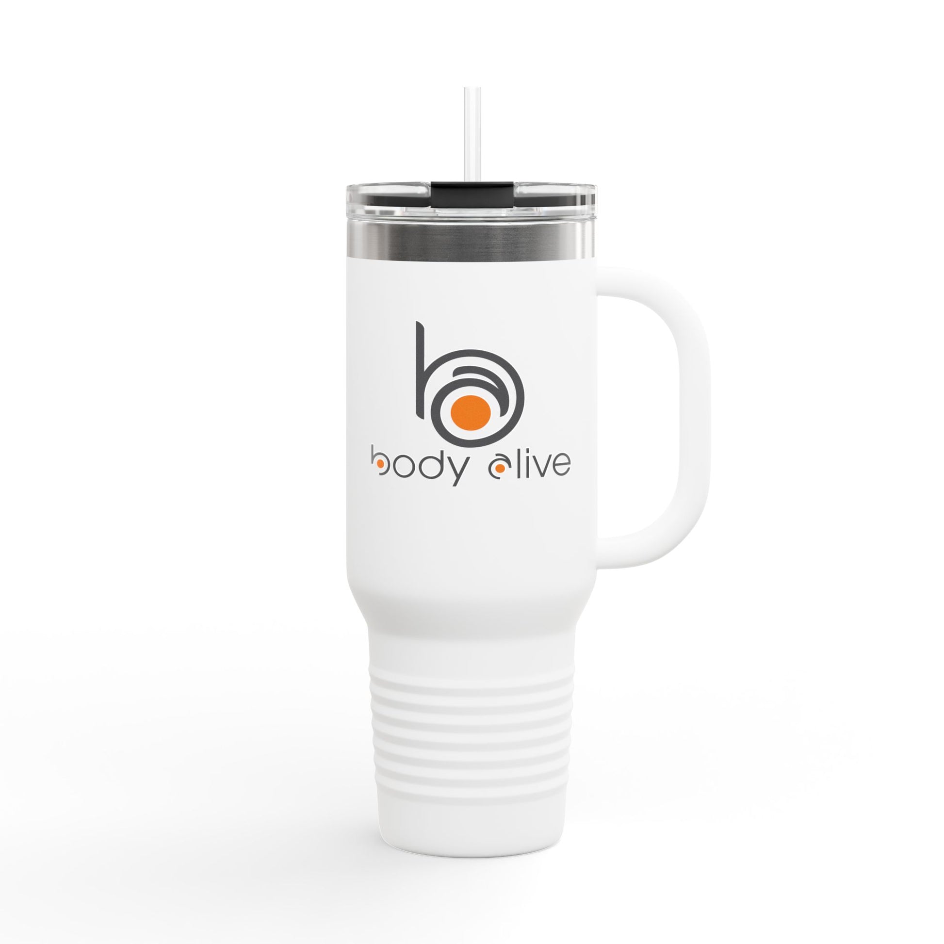 This insulated travel mug is designed for adventure, featuring a durable 100% stainless steel body and a straw with a lid for enhanced convenience on the go.