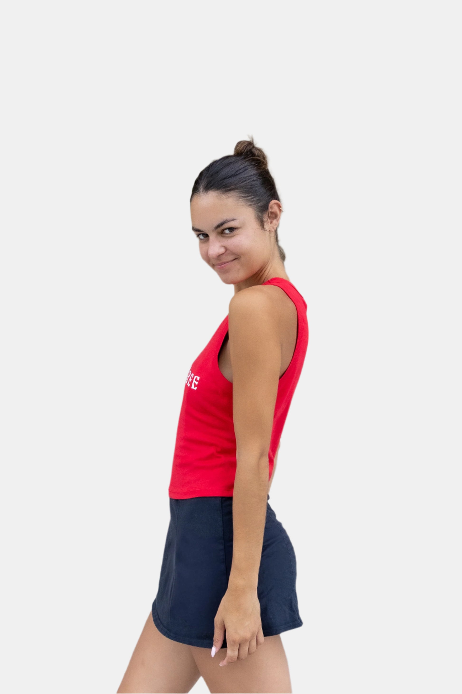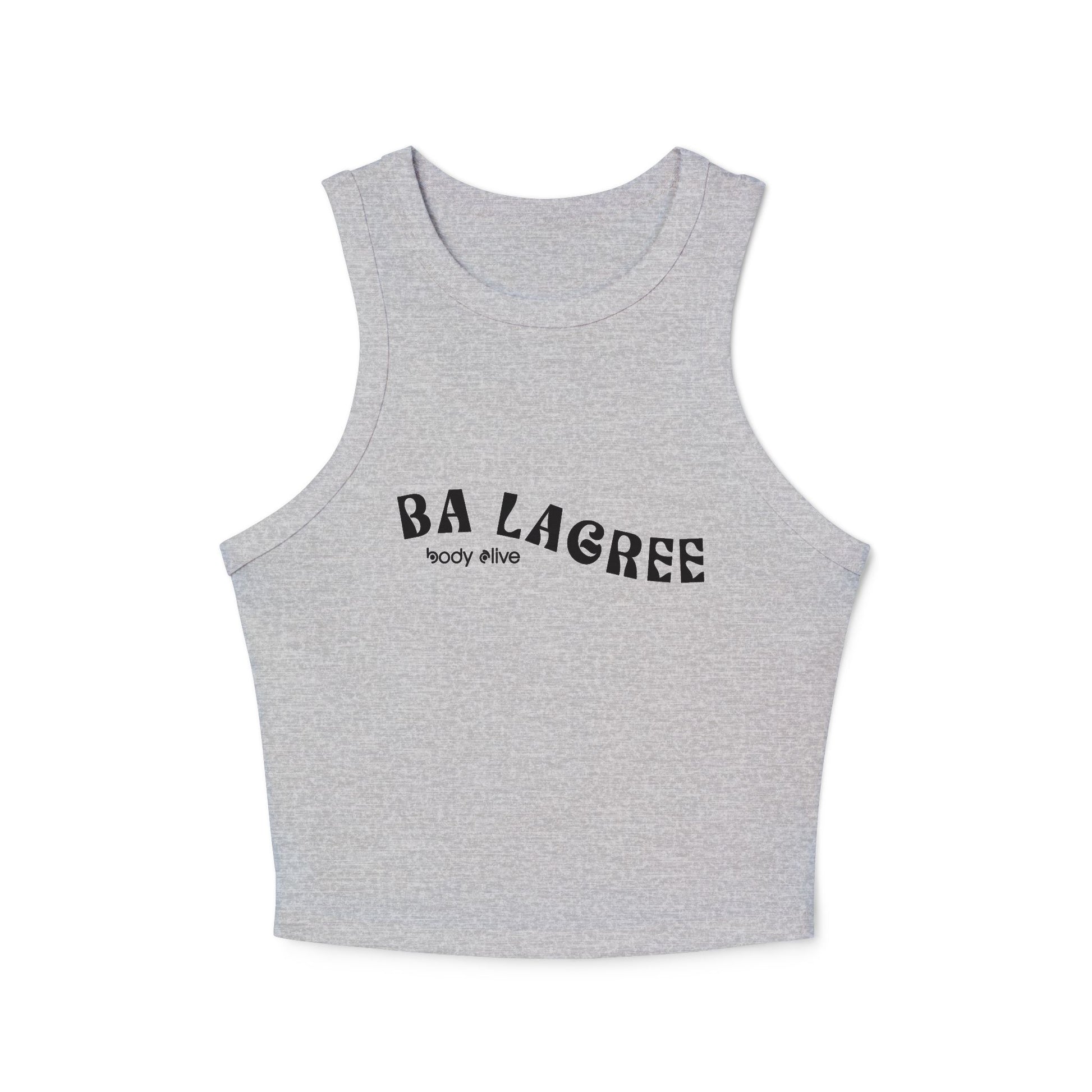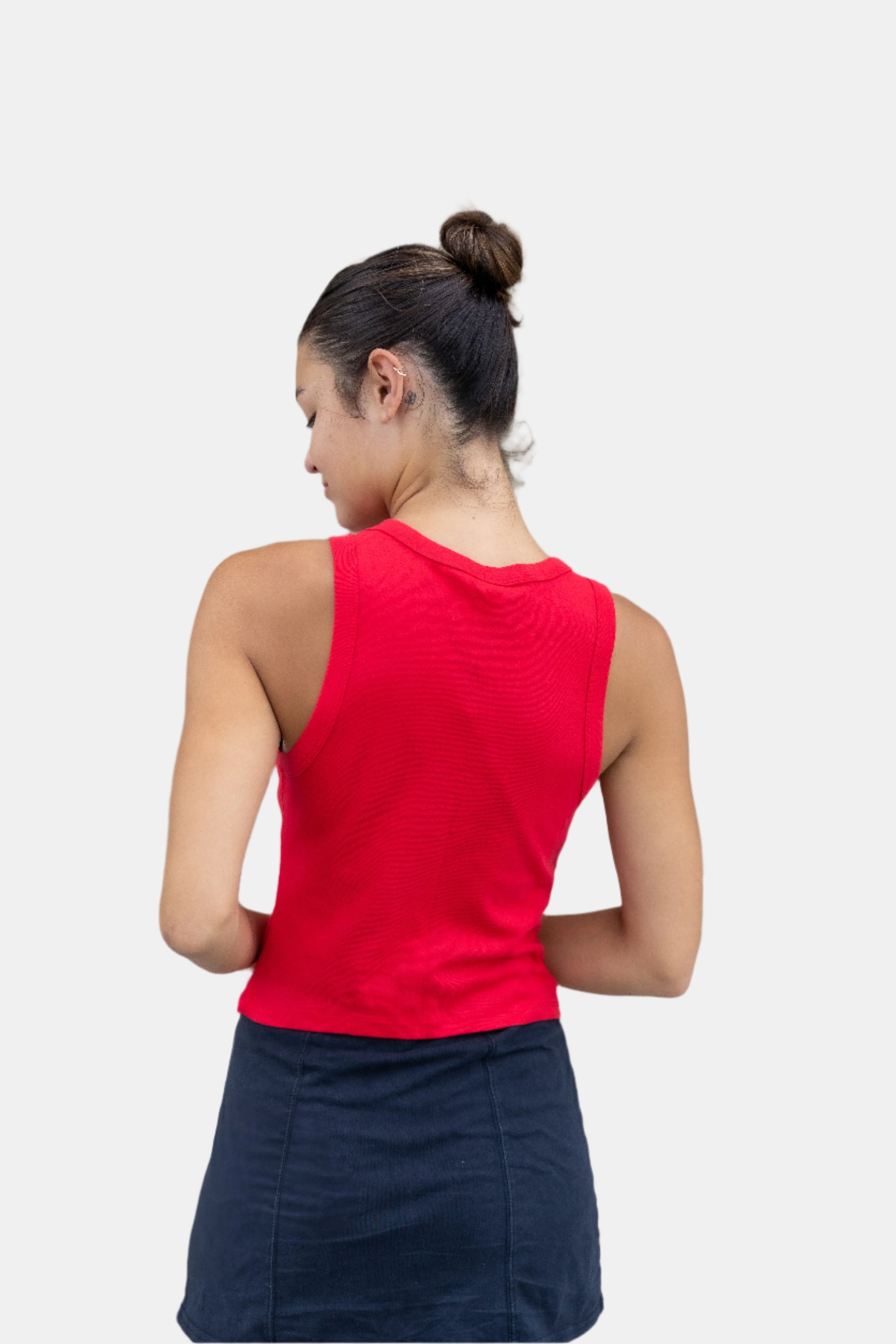 This fitted racer-back tank features a chic 1x1 micro ribbed texture, ensuring a flattering, snug fit.
